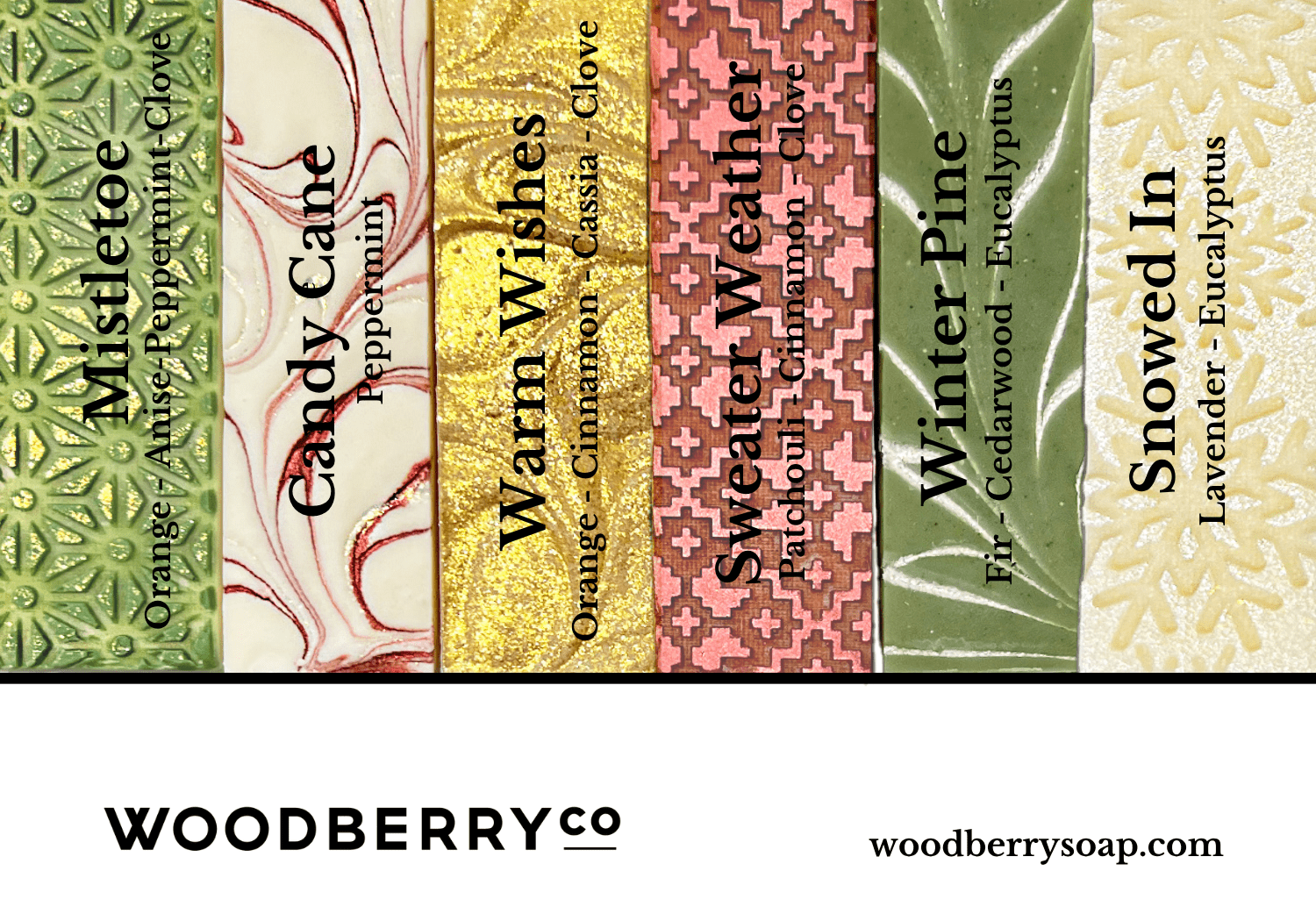 The Woodberry Co. Holiday Box is a festive collection of six handcrafted soaps designed to capture the scents, warmth, and spirit of the holidays. Each bar is infused with pure essential oils and inspired by timeless seasonal moments — cozy nights, winter pine, and sweet peppermint joy.